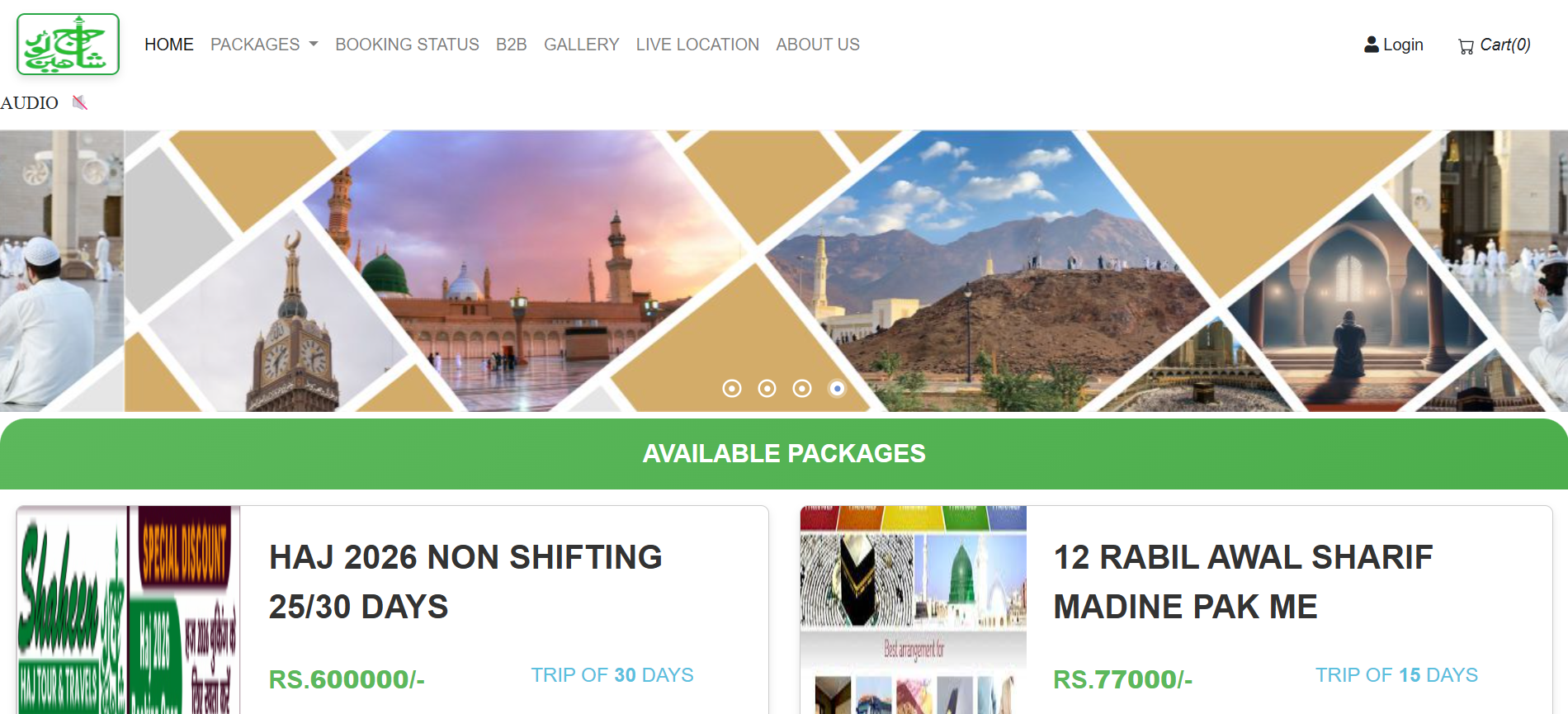 Shaheen Haj Tour & Travels Client: Shaheen Haj Tour & Travels Category: Travel agency website & Booking System Date: Jan 2025 Visit website Share this post Share on FacebookShare on Facebook Share on XShare on X Pin itShare on Pinterest Share on LinkedInShare on LinkedIn Share on WhatsAppShare on WhatsApp Project navigationPreviousPrevious project:Vindhyachal Jagran Party